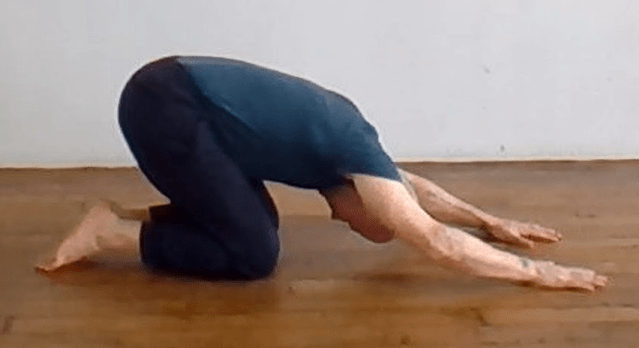 This is considered a resting pose. Here you can see I have the arms out. I am using this as an opportunity to stretch the shoulders. It is also a good relaxed stretch for the inside and front of the hips and the sacrum and coccyx. Especially after working them intensely. Above you can see my butt is off of my feet. For the hip stretch keep the butt on your feet. For a more relaxed variation reach the arms to the back of the room and rest them on the floor along your sides. Also to note, rolling the hips from side to side can help to relax and stretch the hips and groin.