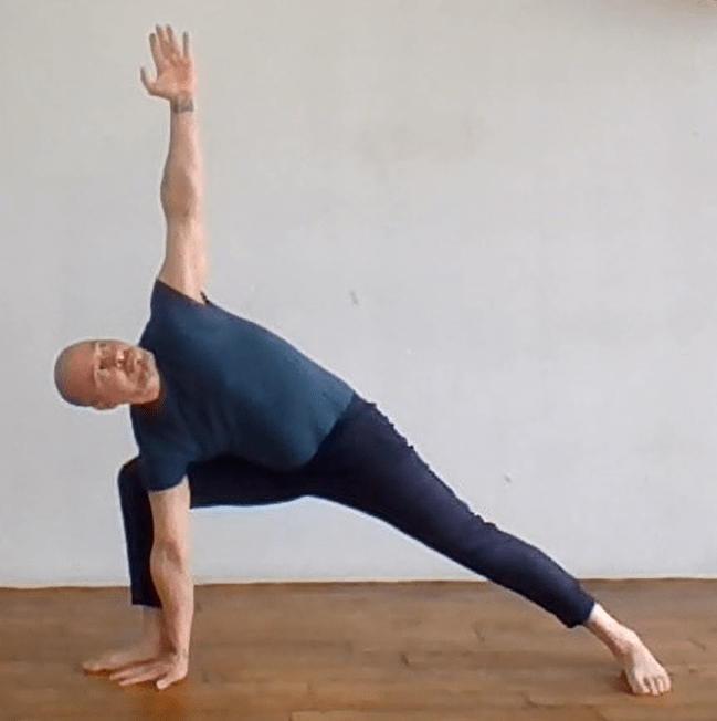 This one is usually entered into from Equestrian by simply placing the hand inside the foot keeping the alignment of the front leg. Knee over the heel, pushing into the Earth. Shoulder is inside the knee and can be used to keep the knee in alignment. The other arm is reaching towards the sky and inline with the other arm. The rear leg is straight back with the foot perpendicular to the front foot. Maintain a thin line of space between the inside of the front foot and the heel of the rear foot. The rear leg is straight and rotating outward behind you. Feel as if you are pushing your foot into the Earth activating the front and inside of the leg. The thigh of the front leg is parallel to the floor. work to open at the hips reaching back with the rear leg and contracting the glutes.