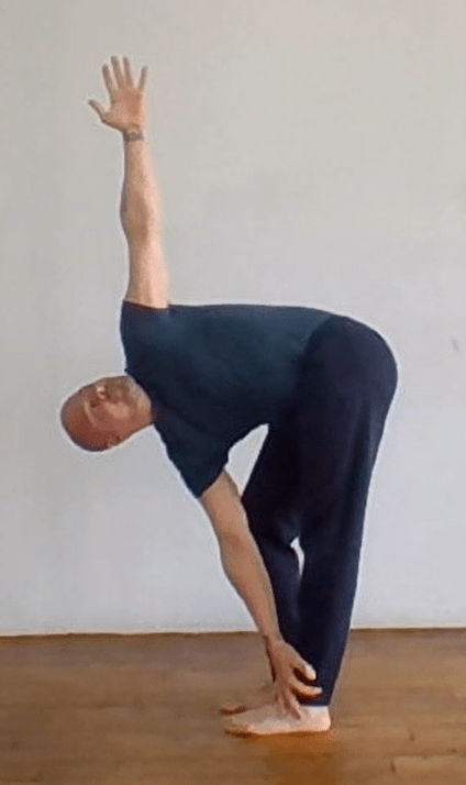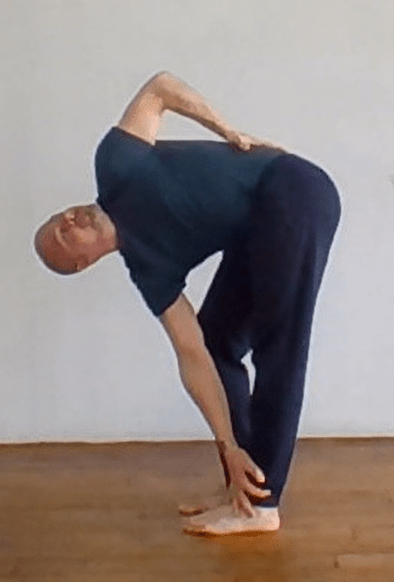 This is a stretch I developed to reach the area of the hip joint towards the sacrum and up to the lower back. The variation with the hand on the back is a lighter one. The hand on the back is in the area where a lot of tension can be. The hand aids in the healing and release of that tension. The variation with the arm up is good for strengthening and working for more rotation. This pose can advance to a lock.